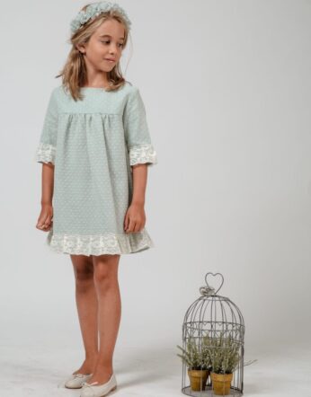 Vestido suelto en verde báltico con plumeti y puntillas( el color de las puntillas puede verse modificado en función de la tintada del proveedor, queremos advertirlo