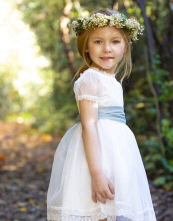 75,00€Vestido realizado en lino azul pastel con volante blanco roto a juego con el lazo.