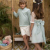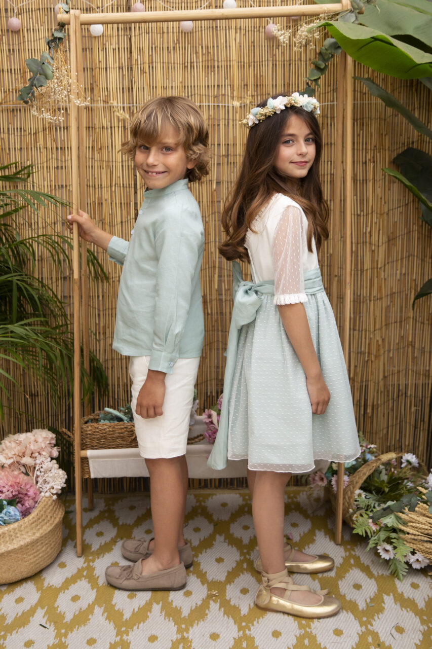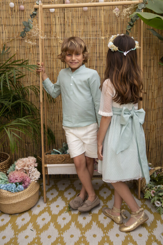 Camisa de lino verde báltico con cuello mao tipo polera.