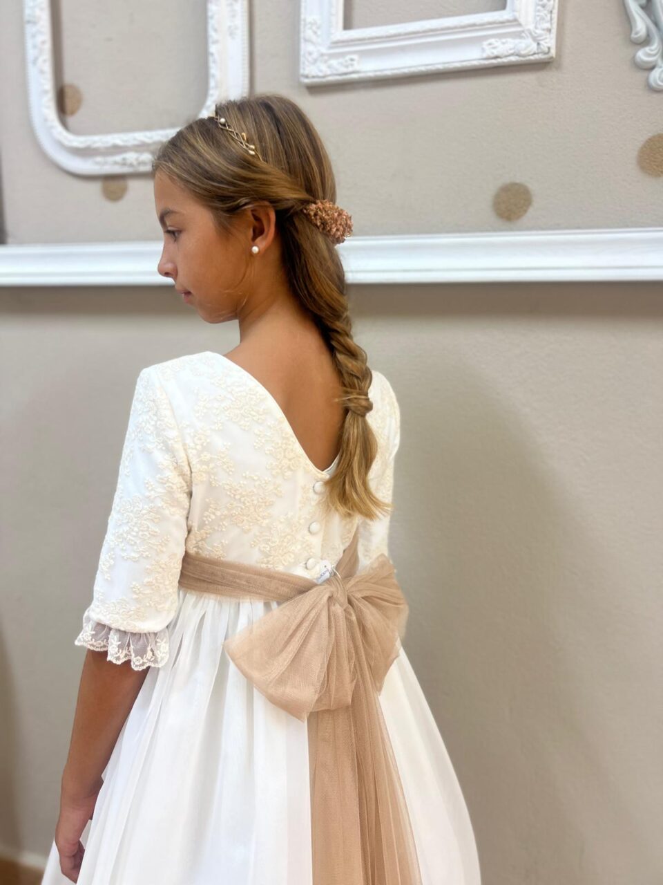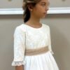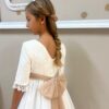 Vestido de comunión con el cuello semi redondeado y espalda con forma de pico en V.