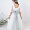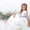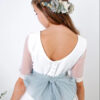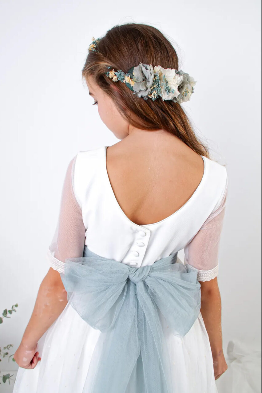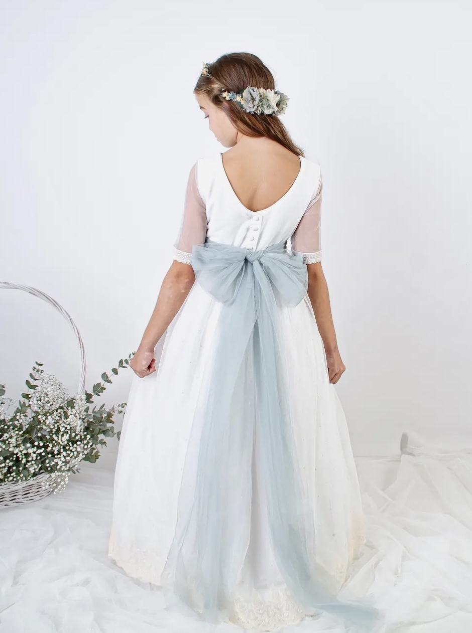 La modelo lleva lazo de tul verde báltico. El vestido puede llevar cualquier lazo de nuestro muestrario de colores (no incluído en el precio del vestido)