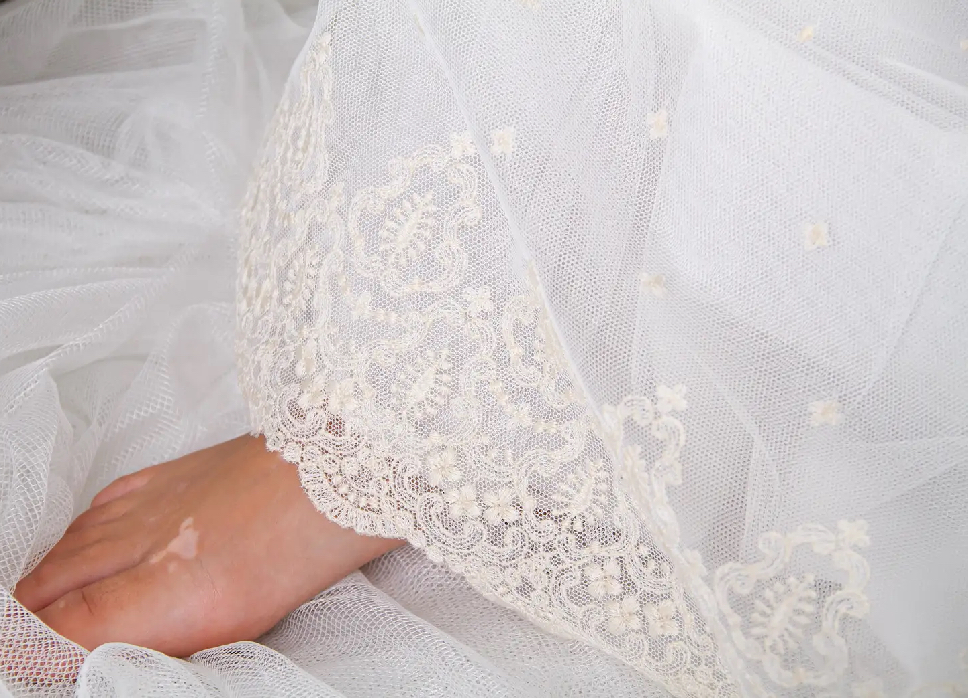 Falda en tul de plumeti marfil con bordado en bajo.