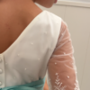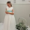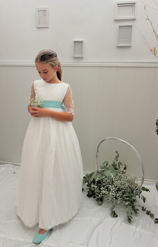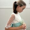 La modelo lleva lazo de tul verde báltico. El vestido puede llevar cualquier lazo de nuestro muestrario de colores (no incluído en el precio del vestido)