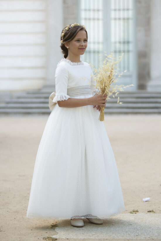 La modelo lleva lazo de tul verde báltico. El vestido puede llevar cualquier lazo de nuestro muestrario de colores (no incluído en el precio del vestido)
