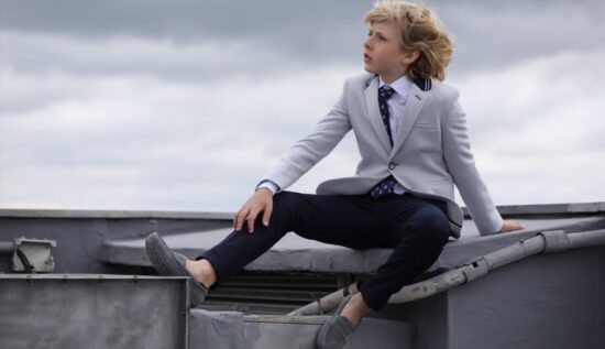 Conjunto compuesto de americana de color gris perla con cuellos de punto marino, pantalón marino, camisa blanca y corbata