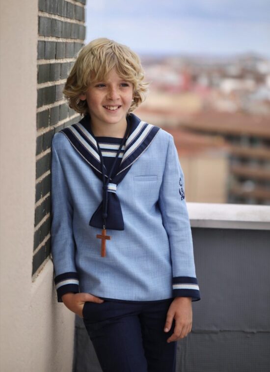 Comunión niño marinero con la casaca azul celeste y el pantalón azul marino, súper bonito