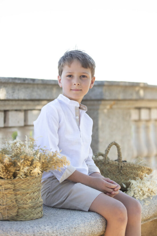 Camisa de lino blanco con adornos en cuello y puños en color arena a juego con la bermuda.