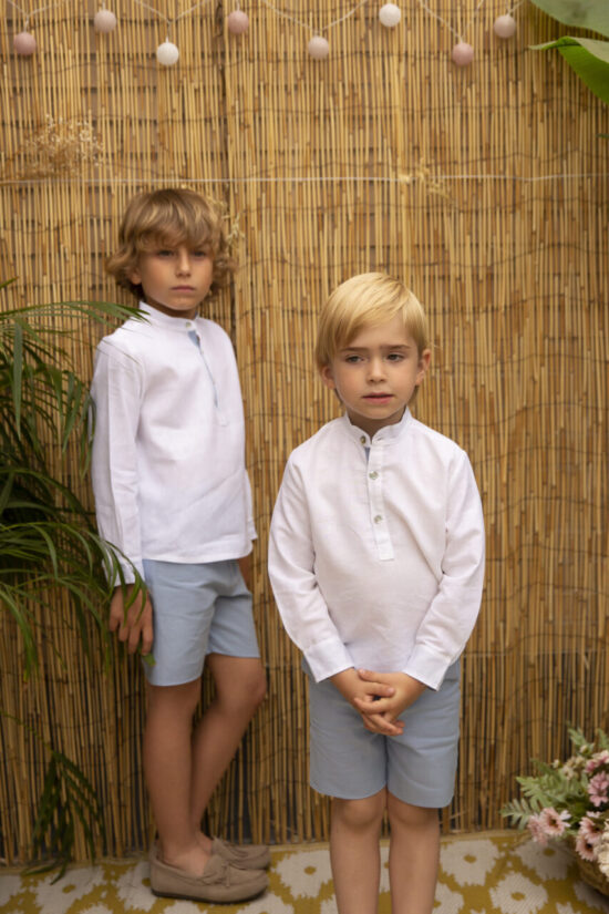 Camisa de lino blanca con adornos en cuello y puños en Azul Francia a juego con la bermuda.